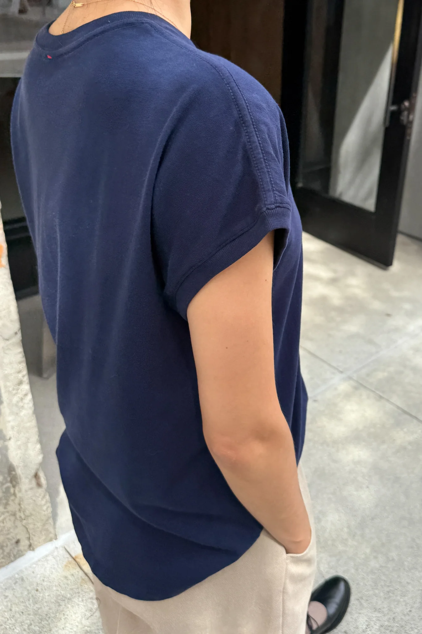 Ease Tee is an edgy dolman tee. She features a high crew neck, shoulder coverage without a sleeve, slightly rounded hem and a contrast rib banded sleeve opening and neck opening. With a crisp color palette and enough length to tuck in or out she is a cool girl's uniform.