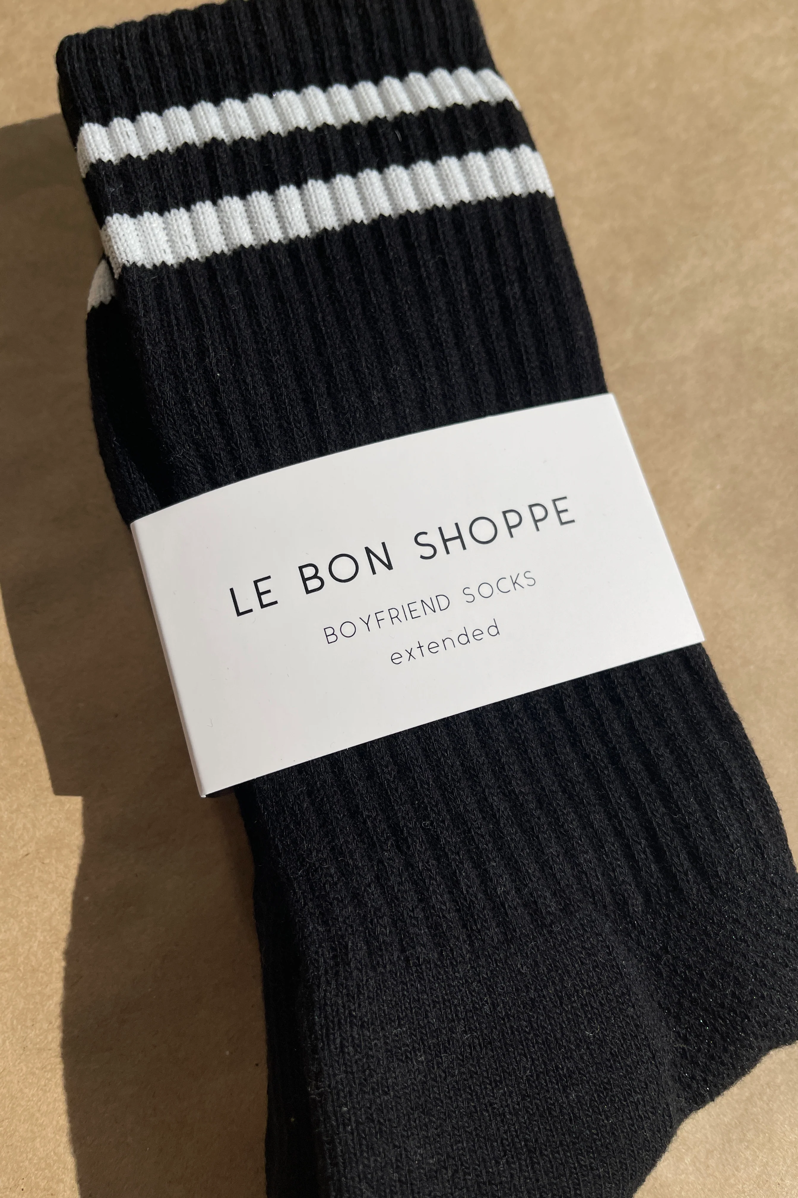 Due to popular demand we created the Boyfriend Socks in extended sizing, which is unisex and men-friendly! They maintain the same design as our bestseller and signature style, Boyfriend Socks, with a slightly bigger foot and longer leg. Their classic, vintage-sporty vibe can be styled with all of any daytime look or worn as the perfect lounge sock to keep your feet comfy at all times.