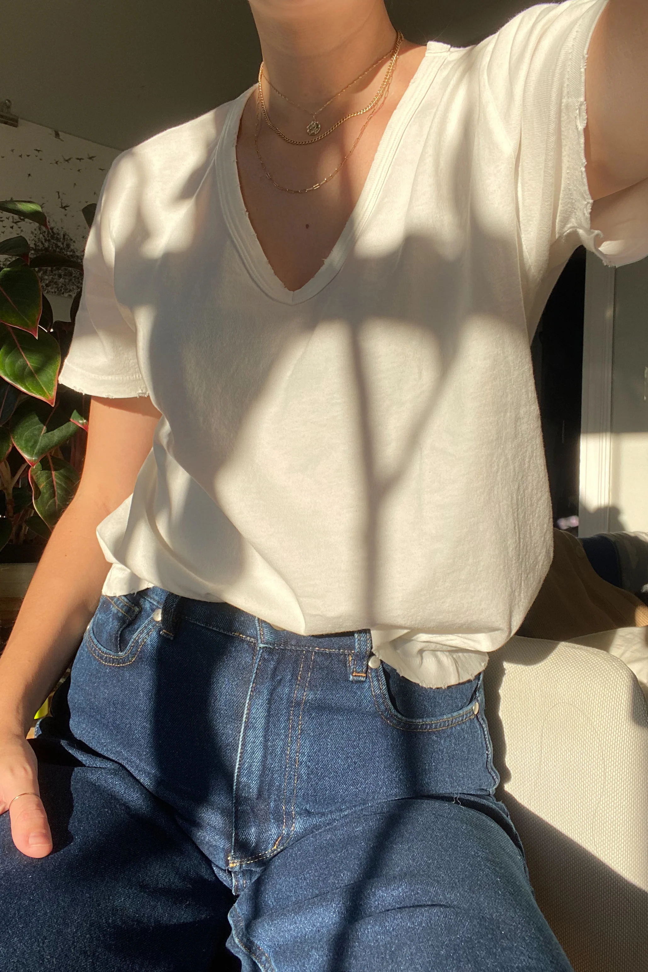 Our classic cut Organic Vintage Boy Tee is now available in the perfect V-neck. For our girls with a heart of gold and a Rock n' Roll soul, c'est La Vie! It is gently distressed for that charming vintage look and maintains a flattering relaxed fit. Garment dyed and pre-washed, it features a rich texture without being see-through and won't shrink in the wash!